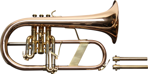 Suitable for all styles of playing, this model has a rich sound with excellent response and tone quality. The instrument is supplied with two mouthpieces/receivers — one for the standard flügelhorn mouthpiece that gives the richest sound and best intonation from the low register through the G on the top of the staff, and the other for a standard trumpet mouthpiece shank that gives consistent intonation from the low register through the C above the staff. Using the trumpet shank mouthpiece receiver enables the player to play in tune from the lowest note through the high register at the expense of some of the richness in the sound. For optimum performance, it may be necessary to change the receiver/leadpipe for the job at hand.
